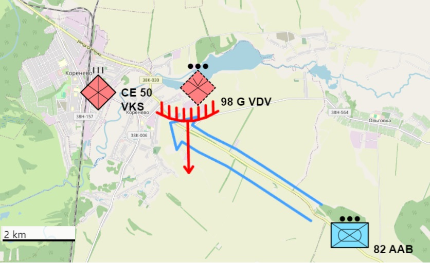 Az ukránok a kiszögellés nyugati oldalán a 82. Légiroham Dandár (lr.dd.) egyes alegységeit vetették be. A műveletek tempója, jellegzetességei és mérete alapján joggal feltételezem, hogy a teljes dandárt nem vetették be (főleg azért, mert amúgy sem volt teljesen felöltve), hanem egyszerre legfeljebb csak egy zászlóalja harcolt Oroszország területén. A 82. lr.dd. feladata volt Korenyevo elfoglalása és ezáltal a nyugati és északi irányú előretörés biztosítása. A csatában nem közvetlenül vett részt, de a tevékenységével erősen befolyásolta a 80. lr.dd. Ez a dandár a 82-eshez hasonlóan harcolt, de az ő feladatuk az északi irányú előretörés volt.