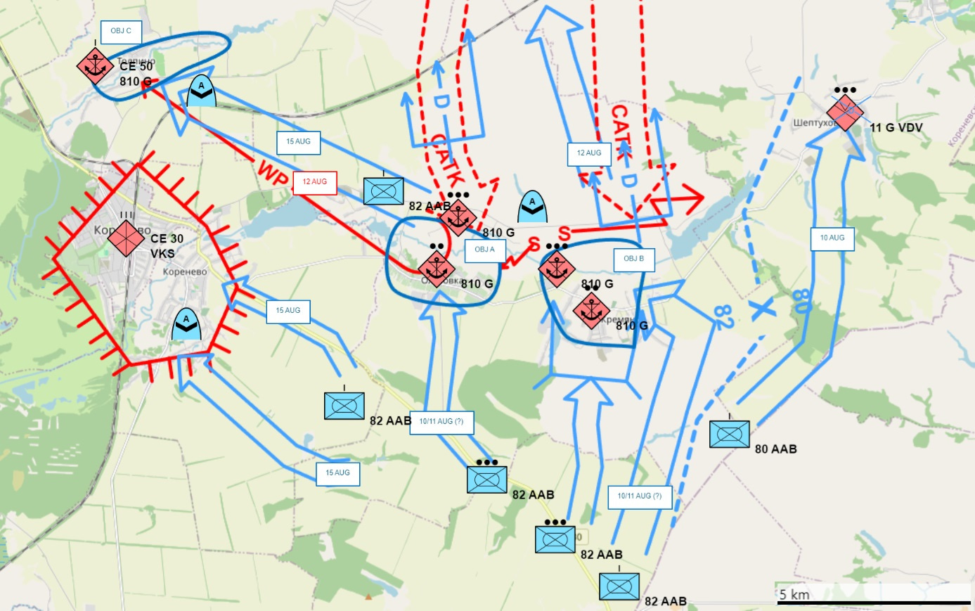 Mint azt a terep leírásánál is láthattuk, Korenyevot kelet felől csak a Krepna patakon átkelve lehet komolyan veszélyeztetni – már amennyiben a frontális támadás nem járna sikerrel. Annak érdekében, hogy Korenyevot keletről támadhassák, viszont át kellett kelni a Krepna patakon, amelynek vonalán éppen a folyamatosan beérkező 810. g.tgy.dd. alegységei rendezkedtek be hevenyészett védelemre. Az idő tehát szorított, a tervező munka valószínűleg már augusztus 9-én éjjel elkezdődött. Az ukránok felismerték, hogy a támadás közelebbi feladata a Krepna patak átgázolható részeinek birtokbavétele Olgovka (OBJ A) és Kremjanoje (OBJ B) településeknél. Ehhez az ott védekező orosz erőket (egyelőre csak szakaszok voltak ott) le kellett győzni. Ahhoz, hogy magát Korenyevot el tudják foglalni, a további feladat pedig Tolpino falu (OBJ C).