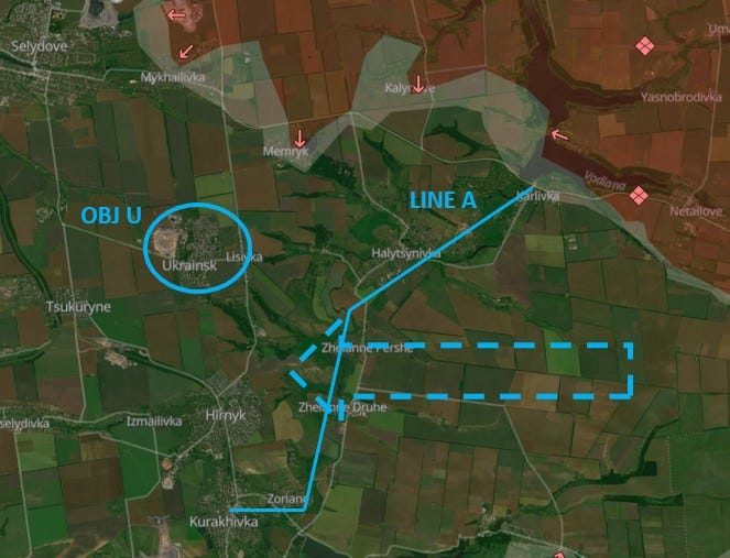 Itt ezzel ismét veszélyes helyzetet teremtettek a Karlivka – Kurakhivka vonal mentén védekező ukrán erőknek (LINE A). Ennek a vonalnak az északi bástyája Ukrajinszk (OBJ U), amelyet, ha elfoglalnak, súlyos helyzetbe hozzák a LINE A-tól keletre harcoló ukrán erőket, akiknek így vissza kell majd vonulniuk (kék szaggatott nyíllal jelölve). Emiatt a k9zeljövőben – szerintem -az itteni harcok súlypontja Ukrajinszk lesz.