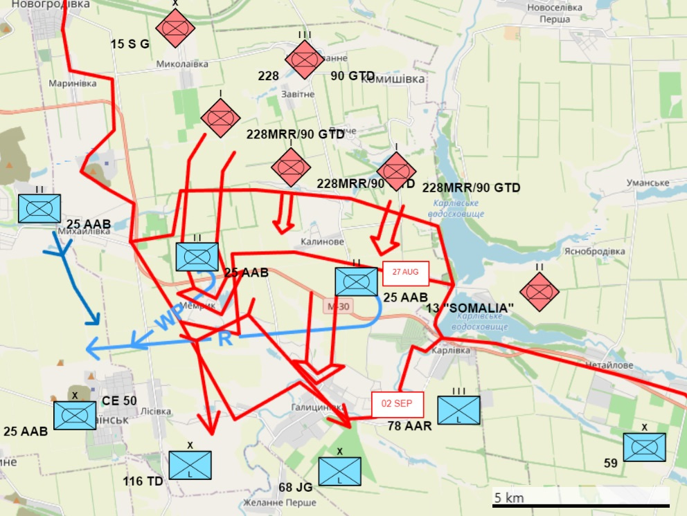 Amikor kb. egy hete erről a frontszakaszról írtam, az orosz erők majdnem ott álltak, mint ahol most (szeptember 2), ez alól a pokrovszki kiszögellésük déli iránya csak a kivétel. Itt – valószínűleg – a 90. Gárda Harckocsihadosztály (g.hk.ho.) 228. Gárda Gépesített Lövészezrede (g.glöv.ezd.) támadott annak érdekében, hogy a Karlivkai-víztározótól délre és keletre védekező ukrán erők hátát fenyegessék.