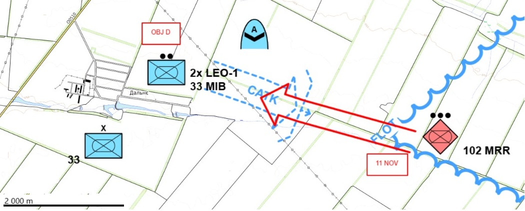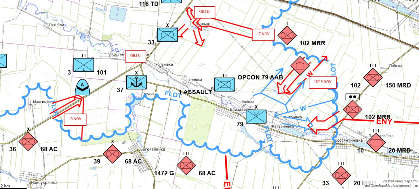 Au même moment, les Russes ont mené l'attaque coordonnée avec l’attaque précédente autour Dalne. Cependant, la 37e brigade de marines ukrainienne (NIB) qui se défendait ici s'est battue avec tant de succès que les Russes n'a réussi à faire passer qu’une seule position de section à 13 novembre. Tout cela signifiait clairement que le coup de grand renflement avait échoué.