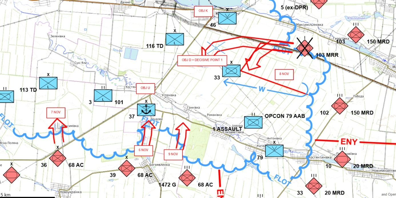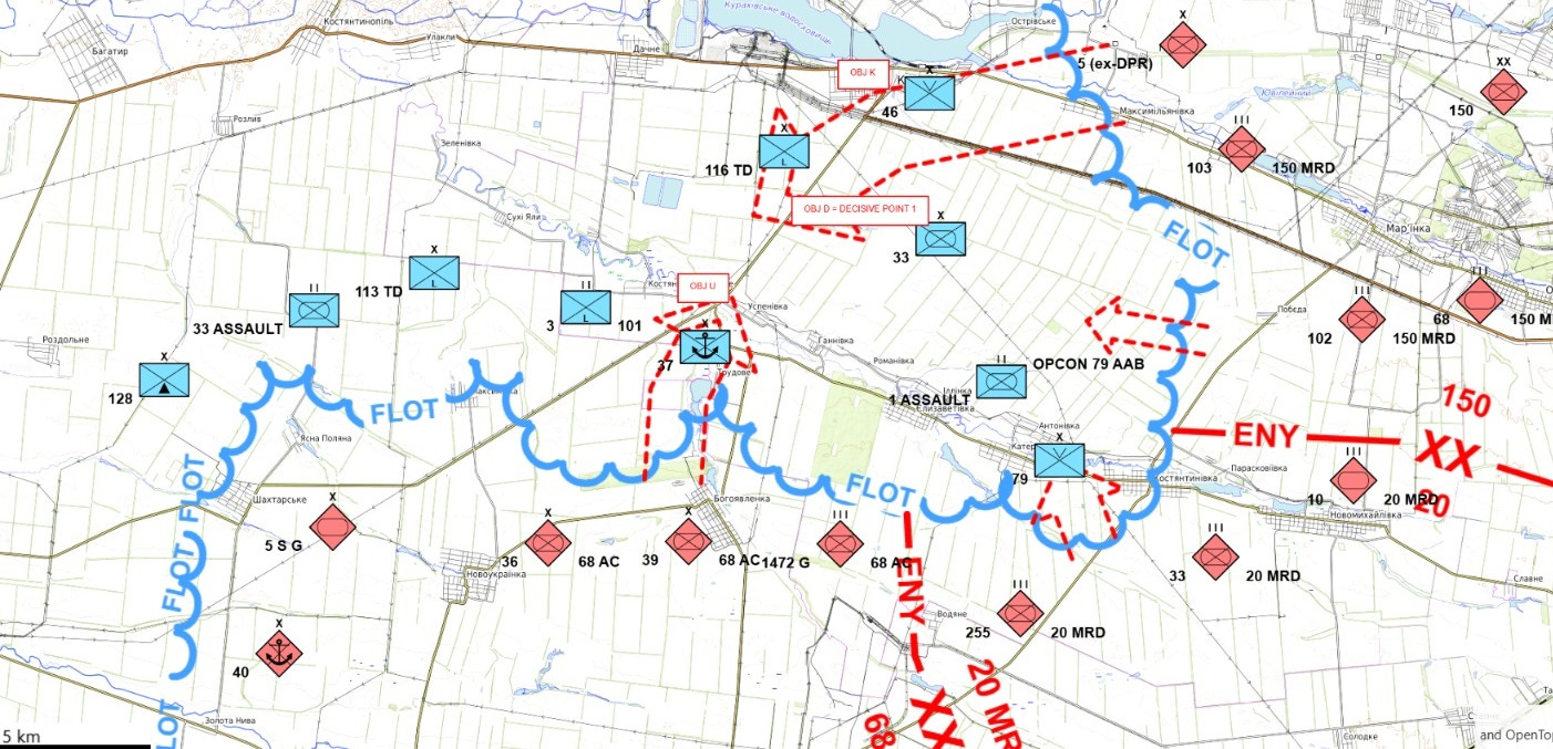 L'objectif évident des Russes était de couper le « renflement de Pobyeda ». En conséquence, Kurakohve (OBJ K) sur l'épaule nord du renfelement et le passage de la rivière près du village d'Uspenivka (OBJ U) sur l'épaule sud étaient deux cibles clés vers lesquelles l'attaque principale russe était supposée se déployer. Le village de Dalne (OBJ D) est marqué comme un Point Décisif 1, dont les Russes ont de bonnes chances d'atteindre leur objectif en s'en emparant.