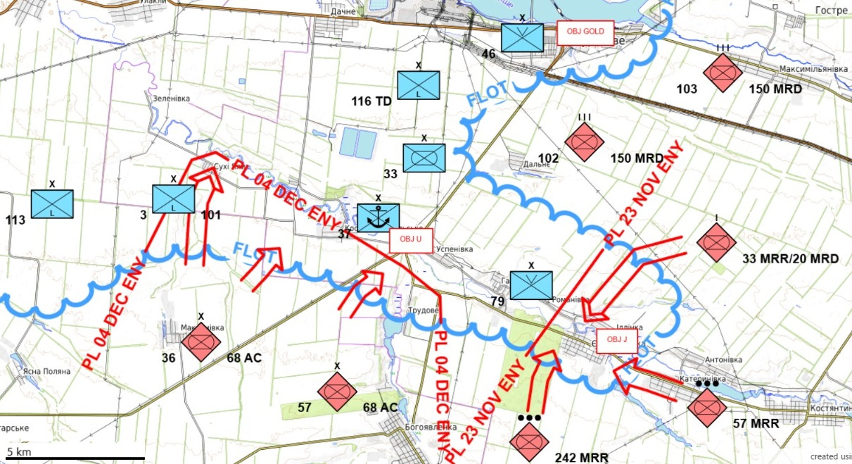 Le 4 décembre, au terme d'une série d'attaques d'une semaine, les forces russes des 36e et 57e MIB s'approchent de l'OBJ U et s'emparent du village de Suhi Yali, rendant le renflement ukrainien pratiquement intenable. L'ensemble de la zone de responsabilité du 79e AAB ukrainien et du 37e MB était sous le feu direct et indirect des Russes, sans parler de la présence constante de drones. Au plus tard dans la soirée du 4 décembre, un ordre de retrait aurait dû être reçu pour les forces ukrainiennes dans le renflement.