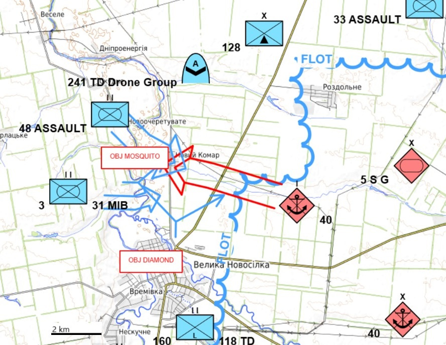 Profitant de la distraction causée par les attaques continues autour d'OBJ DIAMOND, une compagnie d'infanterie mécanisée a lancé une attaque le 1er décembre contre Noviy Komar (OBJ MOSQUITO). L'attaque a profité du lit du ruisseau et de la végétation environnante, a franchi les défenses du 48e bataillon d'assaut ukrainien qui défendait la zone et a pris pied dans le village. Cela a essentiellement coupé les routes logistiques des défenseurs d'OBJ DIAMOND. Ici, cependant, contrairement de la ligne de front décrit ci-dessus, les Ukrainiens ne combattaient pas côte à côte de manière isolée, mais étaient unis par une organisation militaire (que je n'ai pas encore identifiée) au niveau opérationnel.