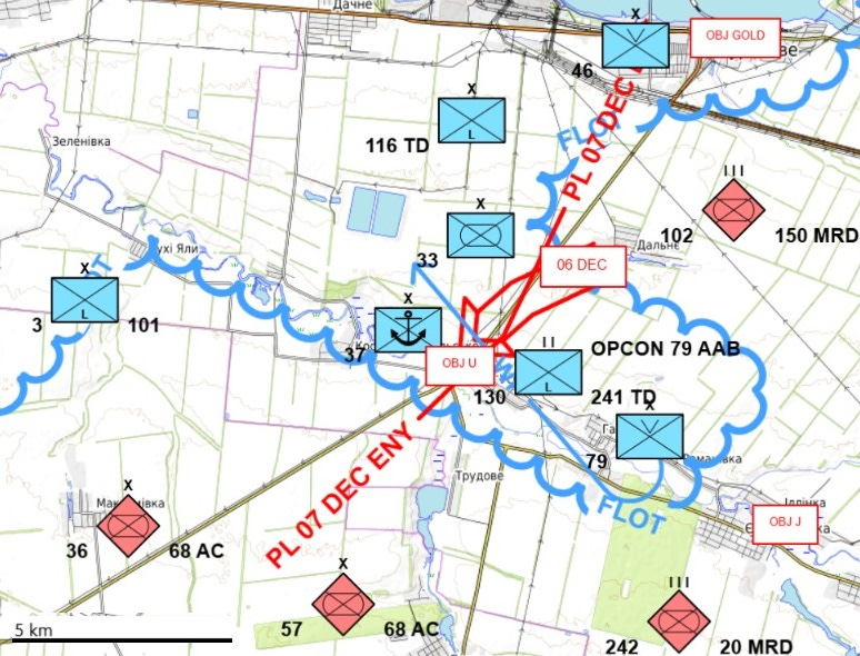À la fin de la journée du 7 décembre, les Ukrainiens s'étaient repliés sur la ligne marquée « PL ENY 07 DEC ». Cependant, si le système de commandement et de contrôle au niveau opérationnel avait fonctionné et qu'il n'avait pas été nécessaire d'attendre à nouveau le commandement et le contrôle au niveau stratégique, ce retrait aurait pu être effectué avec beaucoup moins d'inconvénients. Le moral des soldats n'est certainement pas rehaussé par le fait que leurs propres commandants les ont à nouveau laissés tomber...