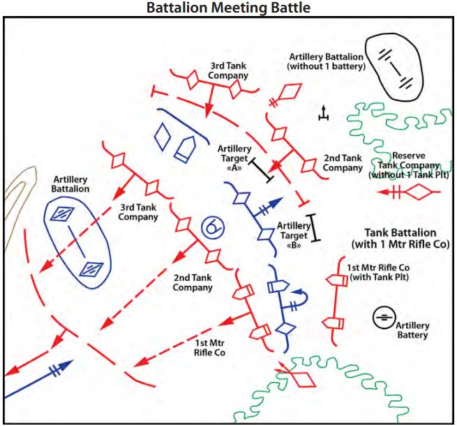 Orosz harckocsi zászlóalj harccsoport találkozó harcának elvi vázlata. Forrás: Grau, Bartles: The Russian Way of War